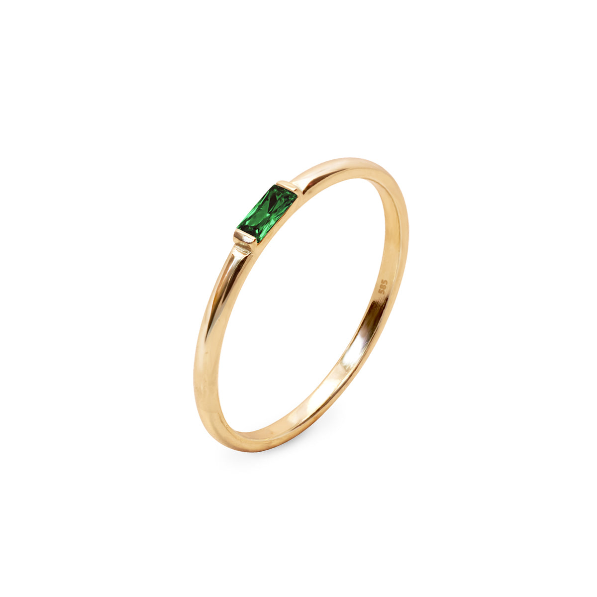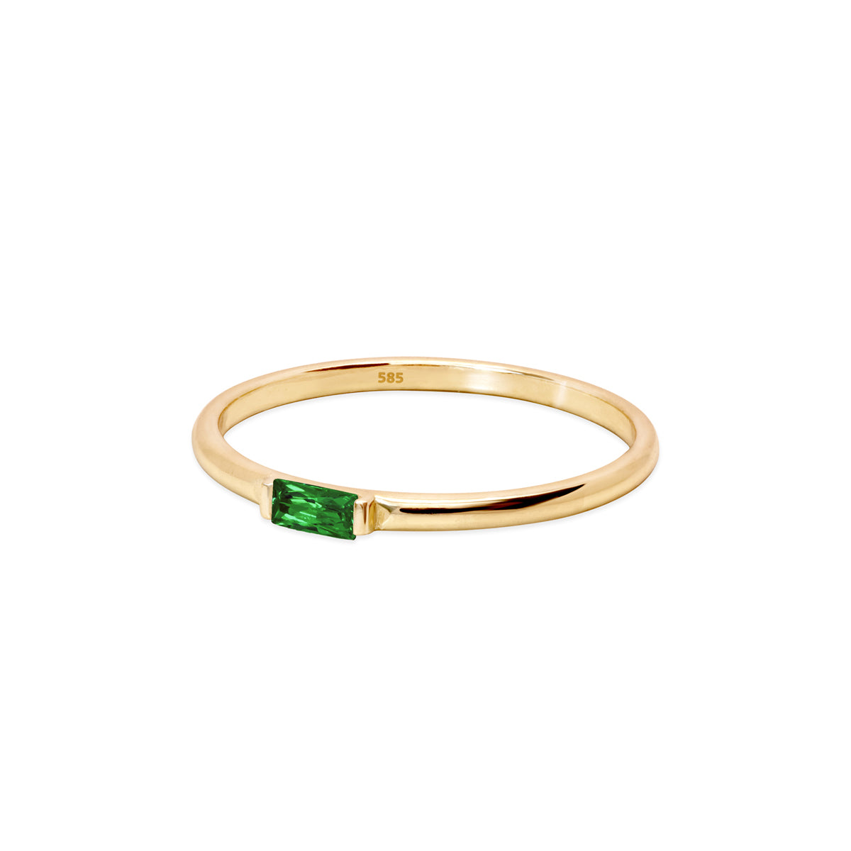 Baguettes are always a good idea. This piece features a baguette-cut natural emerald in 14ct yellow gold. Can be worn alone as a statement piece, or paired with other rings to create a stacked look.